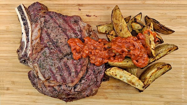 тот же стейк рибай, но на короткой рёберной кости. Два отличия «ковбоя» от обычного рибая: наличие кости и увеличенная толщина стейка, задаваемая костью. Про стейки рибай, с примерами рецептов — в статье «Рибай — что это такое».