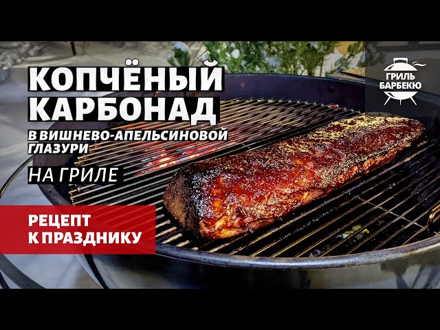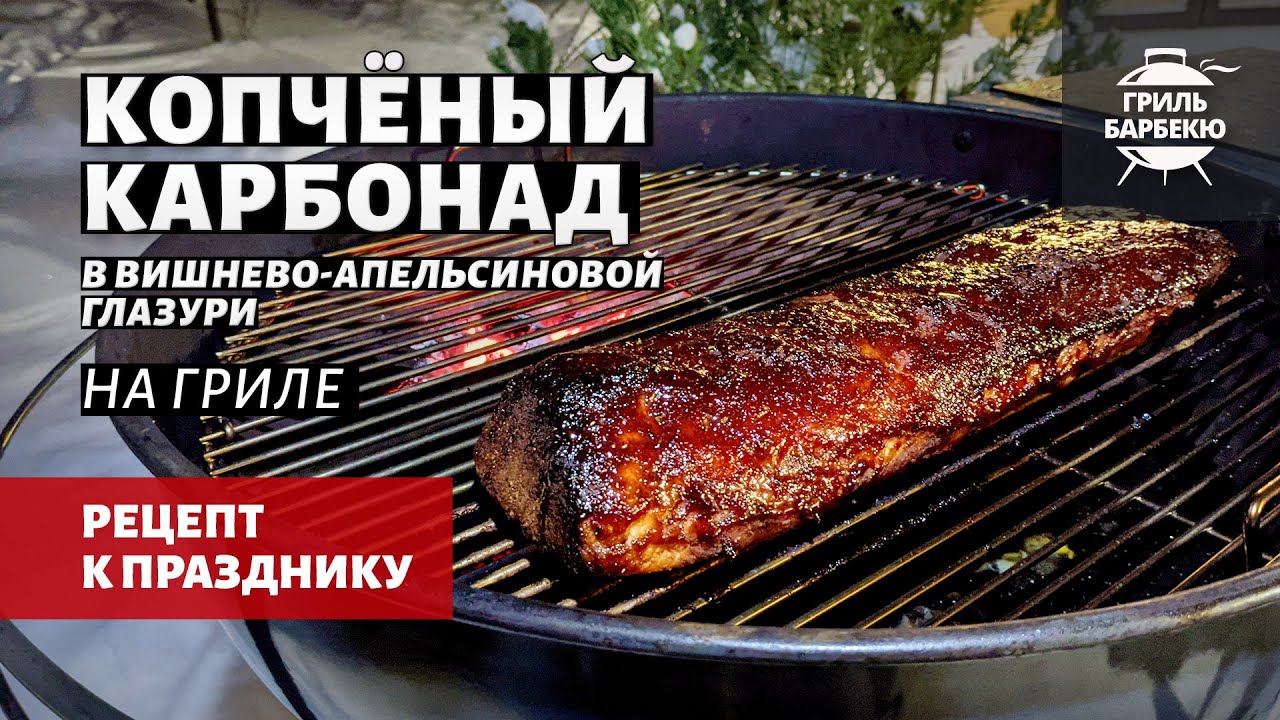 Копчёный карбонад в вишнёво-апельсиновой глазури на гриле — это праздничное блюдо из свинины, с ароматами Нового года и глинтвейна! Приготовьте его по нашему рецепту методом low-and-slow — получится сочное нежное мясо с очень вкусной тёмной корочкой. В ней и нотки карамели, и вкус вишни, и праздничный апельсиновый аромат. Карбонад остаётся сочным, даже когда остынет, поэтому не обязательно подавать его горячим — можно и холодным в нарезке, тонкими пластинками по 0,7 см. Для идеального результата подержите мясо в рассоле 12-24 часов (но тогда уменьшите количество соли для пряной смеси, указанное в рецепте). Рецепт подходит для любых грилей, смокеров и коптилен, где можно поддерживать стабильный очень слабый жар 120 °C.