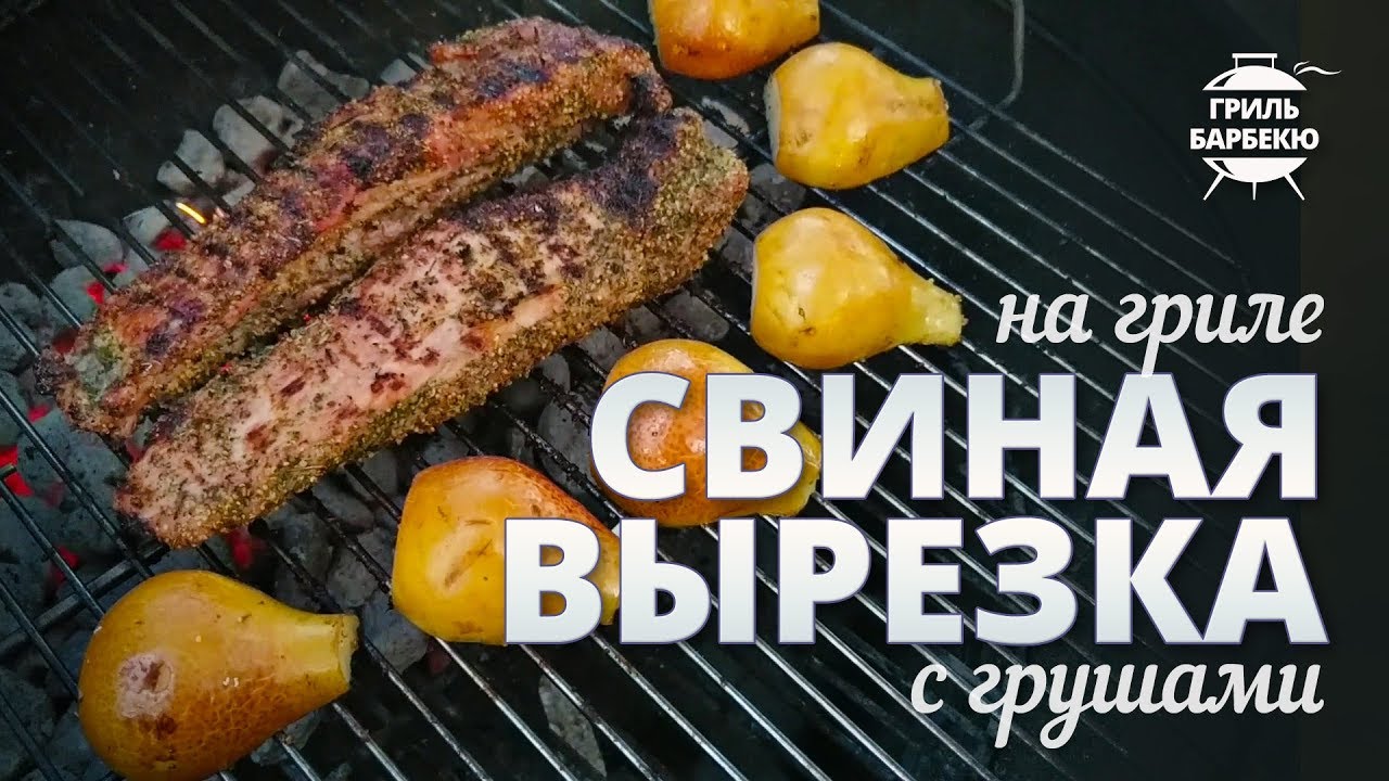 Выложите свиную вырезку на решётку гриля в зону прямого жара. Закройте крышку и жарьте мясо 15-20 минут. За это время нужно будет 1-2 раза перевернуть свинину. За 5-8 минут до окончания жарки мяса поместите на решётку рядом с ним половинки груш. Разложите их срезом вниз рядом с мясом. Через 3-4 минуты переверните фрукты лопаткой. Снова закройте крышку гриля, на заключительные 3-4 минуты.