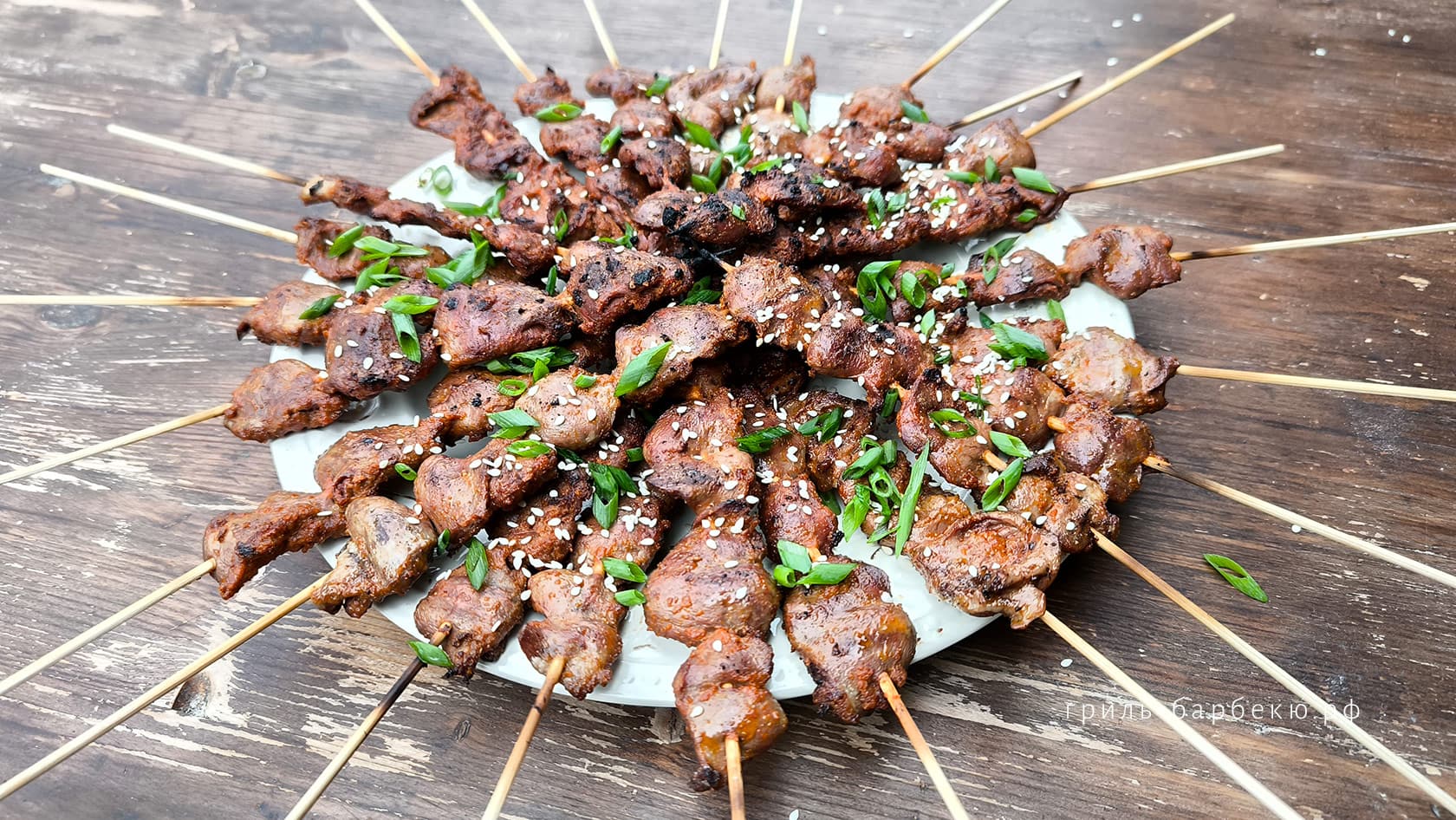 Когда вкус — в самое сердечко! На гриле эти шашлычки жарятся всего 10-12 минут, а перед этим полчаса маринуются в специях и пряностях с растительным и кунжутным маслом. Спросите гостей, из какого мяса сделана закуска (кстати, отличная к пиву), — и наверняка услышите разные варианты!