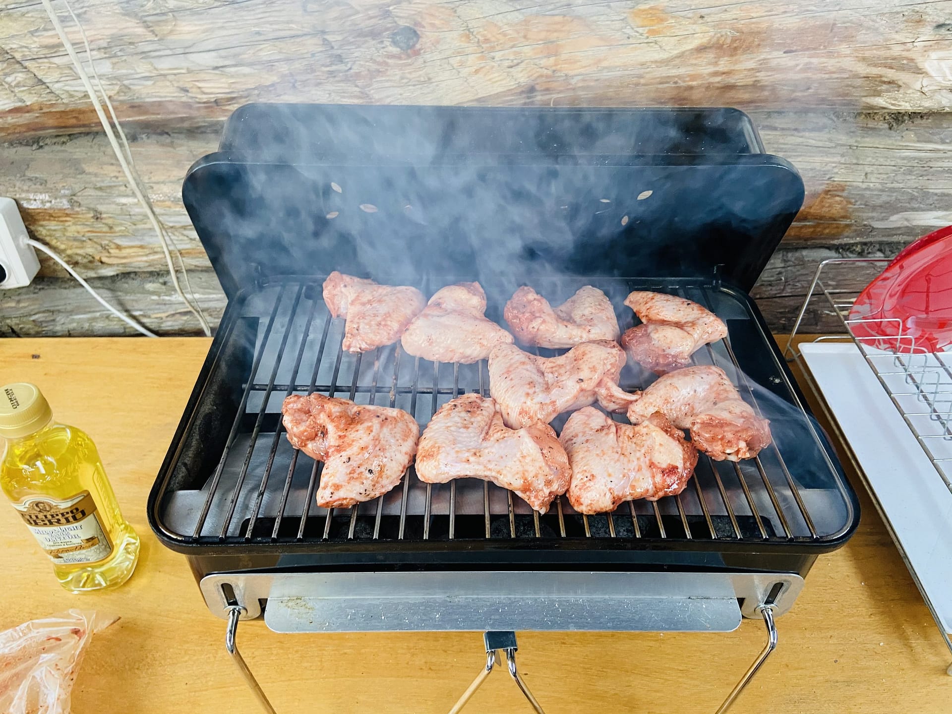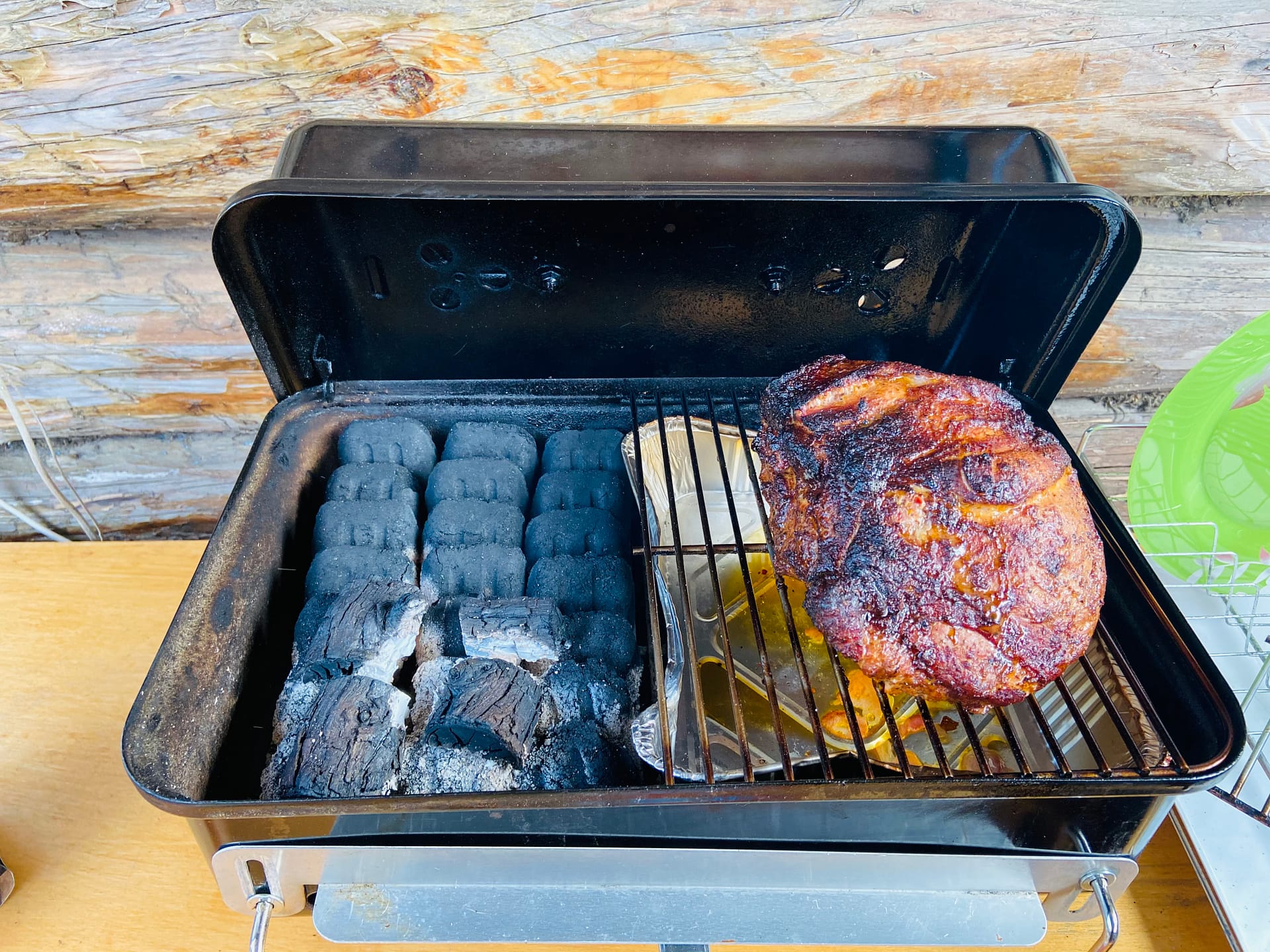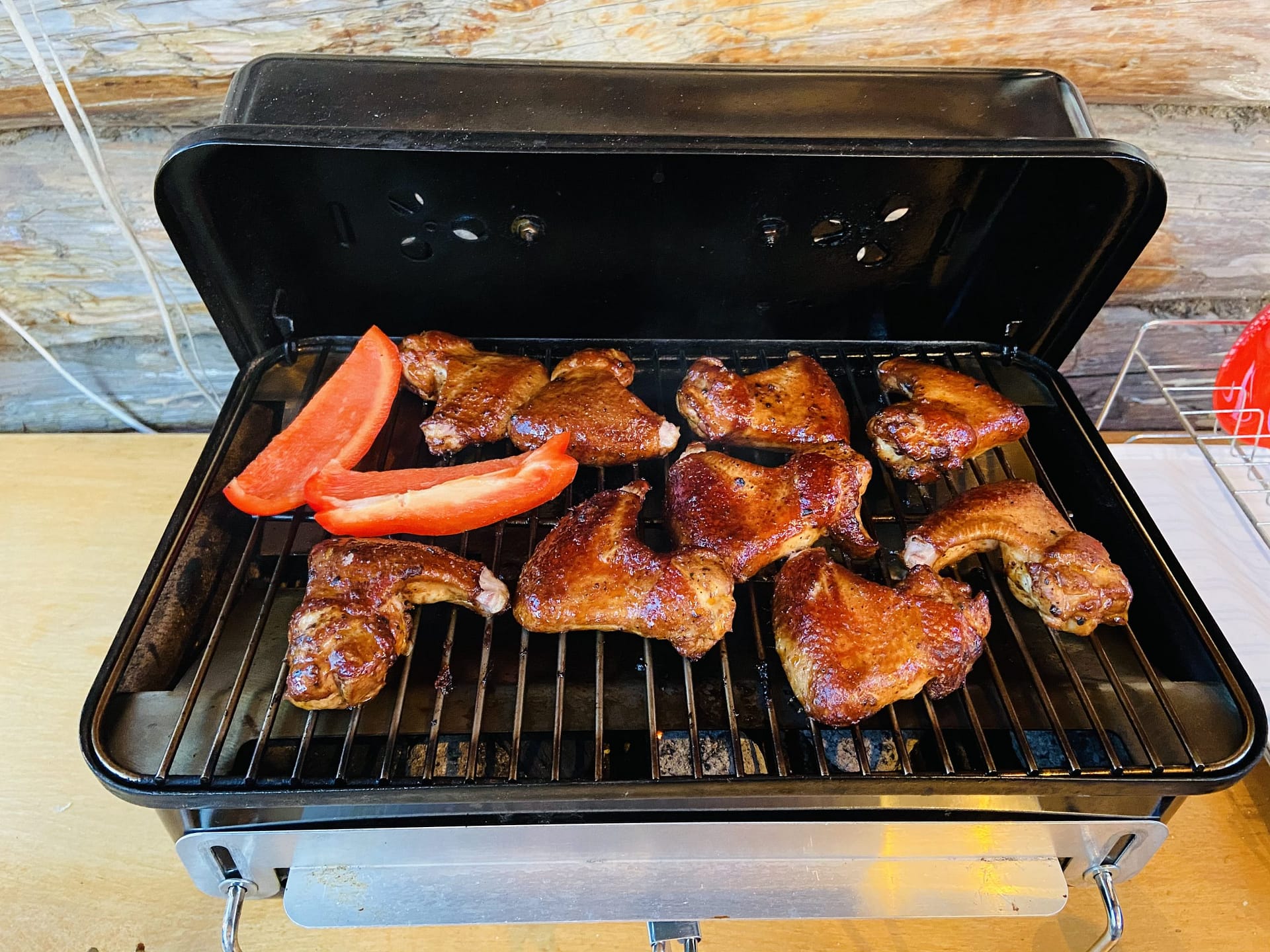 Расход брикетов просто мизерный! Постоянно лежит в багажнике. Можно (при распиле решетки) положить внутрь стартер с брикетами, решетку, щипцы, продукт, щепу и пойти на улицу. Живу на набережной у Волги, так зимой ходили на тот берег, там делали крылышки и обратно приносили затушенные брикеты.