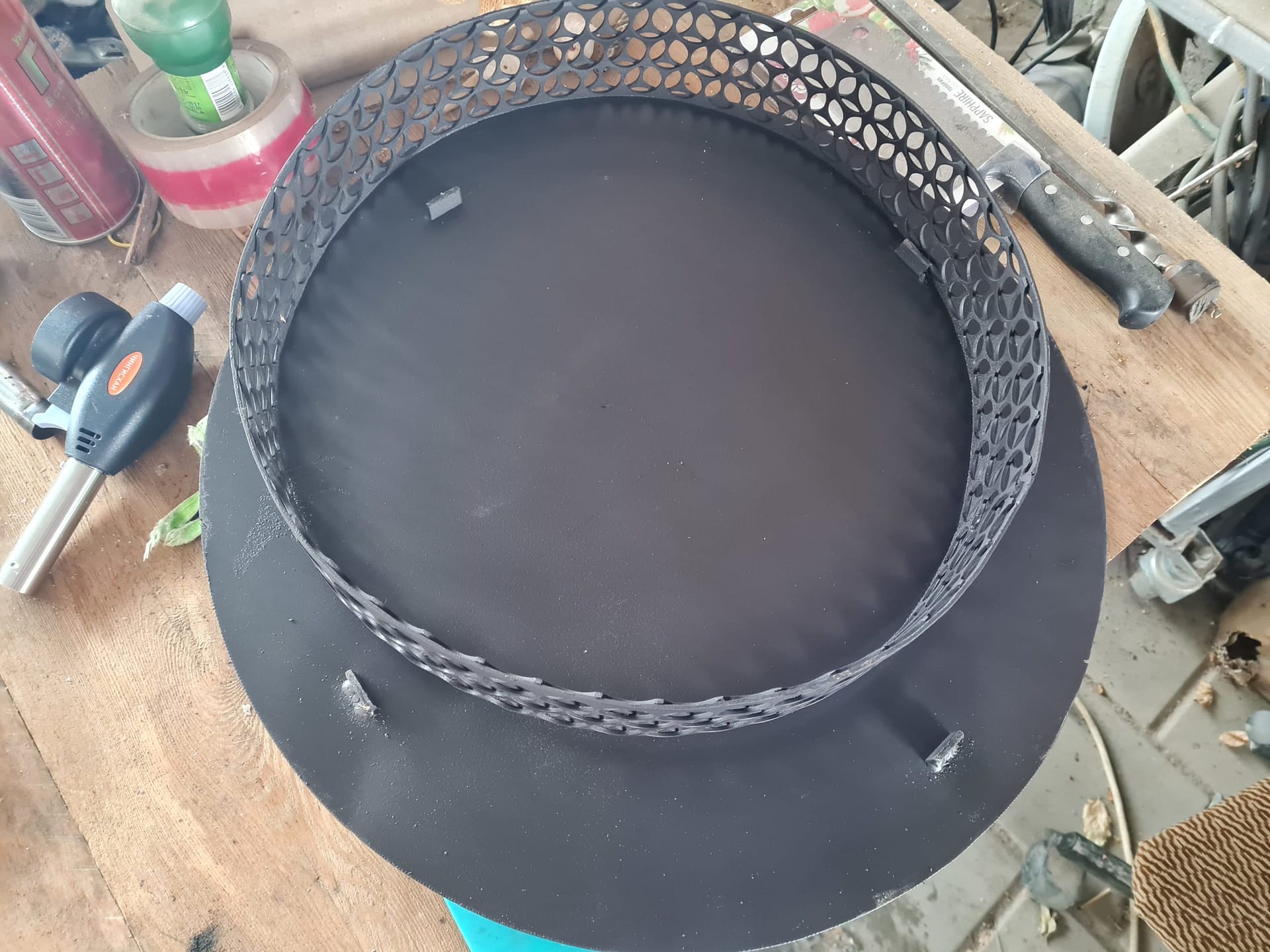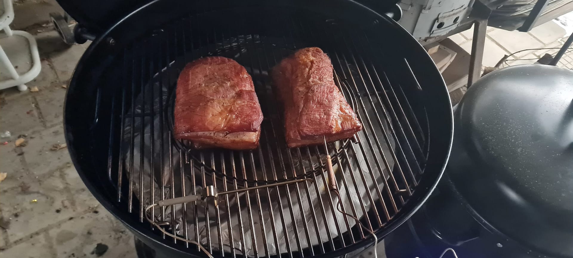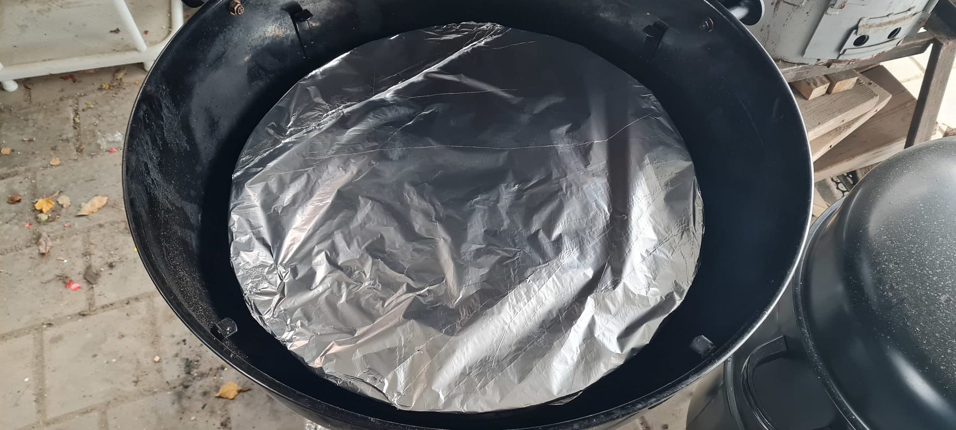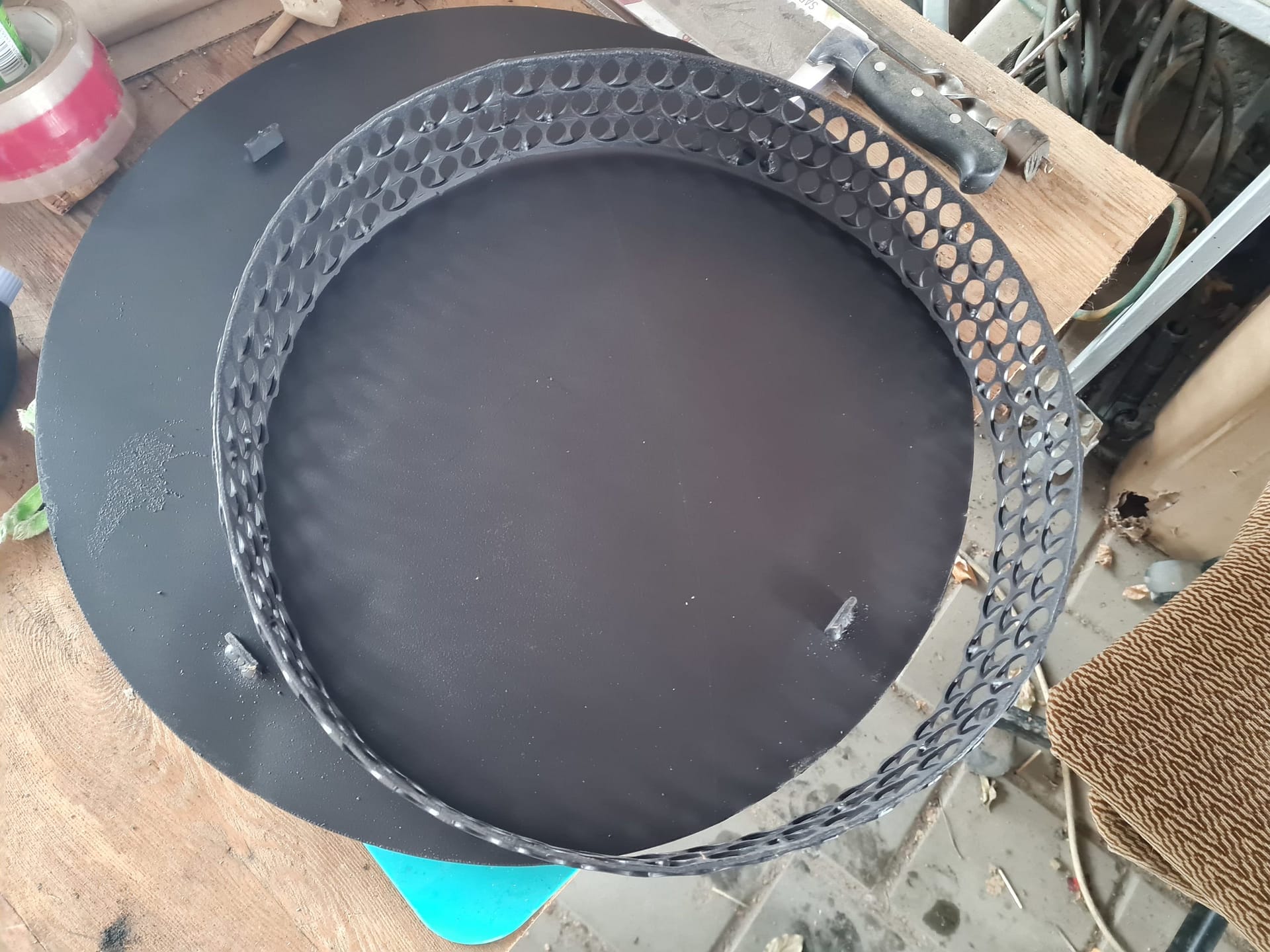 Отсекатель готов. Кольцо из выштамповки толщиной 2 мм сварено в 2 слоя. Сам жароотсекатель из стали толщиной 3 мм. С внутренней стороны приварены ограничители, чтобы не скользило по кольцу. Покрашено огнеупорной краской. Сегодня провел испытания, все работает. Готовил бекон по рецепту Сергея. Думаю по краю жароотсекателя по кругу приварить проволоку диаметром 5 мм, чтобы фольга, которой свеху укрываешь жароотсекатель, работала как поддон. Фото прилагаю