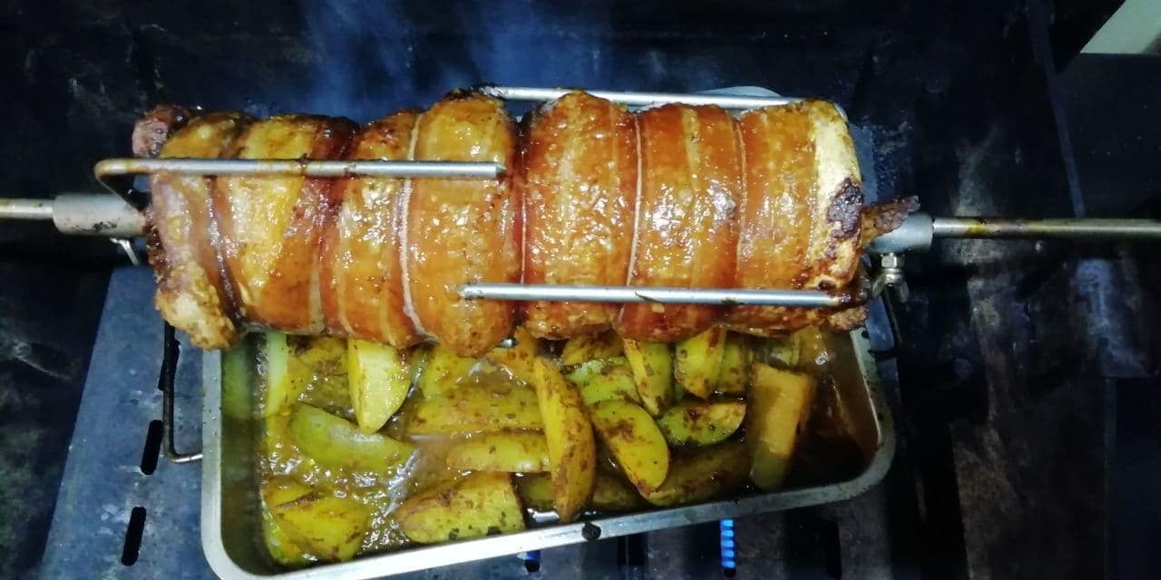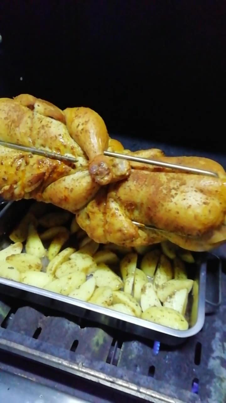 Вчера провёл испытания, насадил две курицы общим весом 4,2 кг. Мотор справился, работал 2 часа. Так долго готовил курицу, потому что сначала 40 минут подкоптил на 110 градусах, а потом уже прибавил температуру )))
