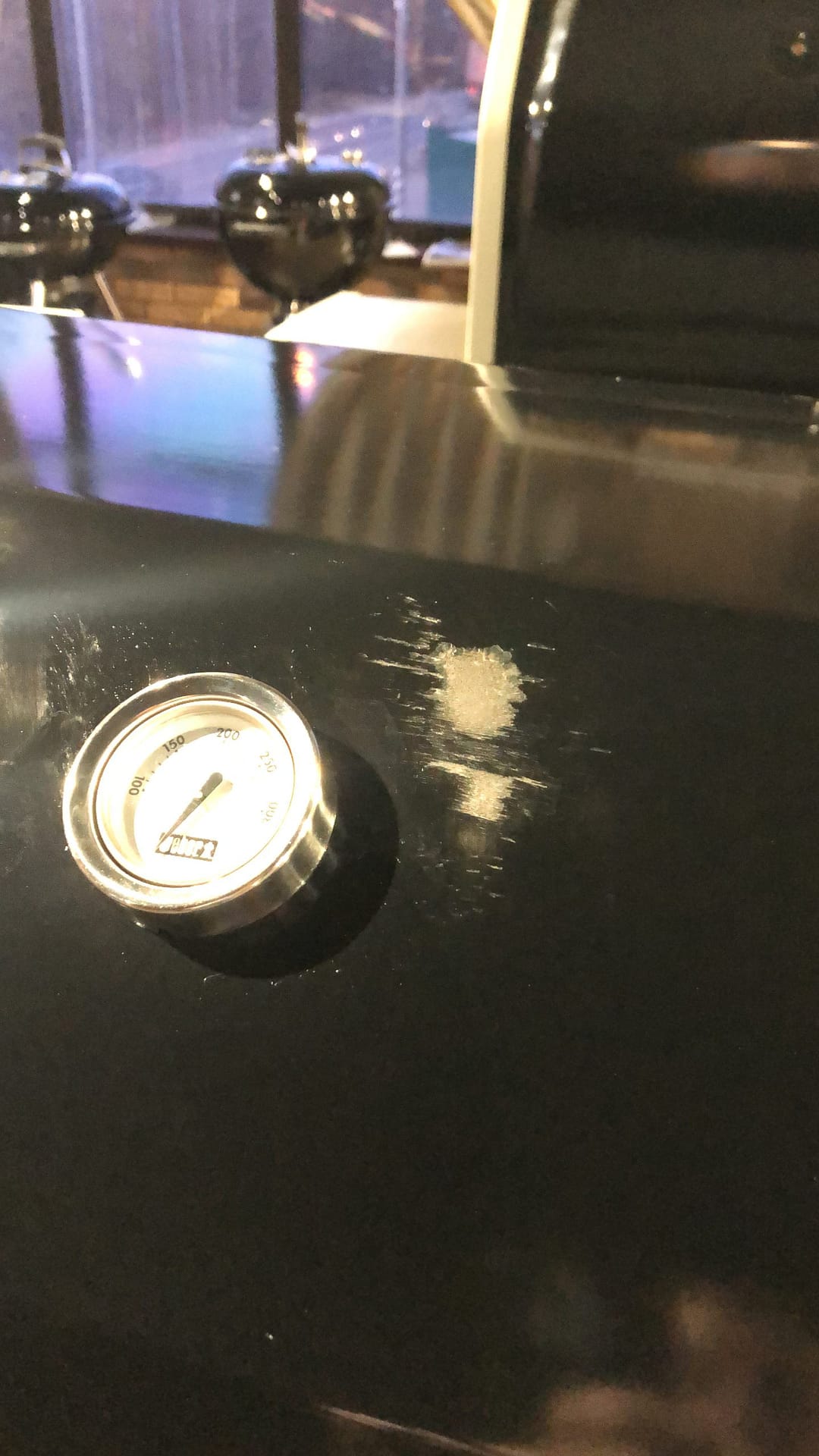 Похоже эмаль отвалилась тоже при ударе, так как внутри крышки в этом же месте тоже эмали нет.