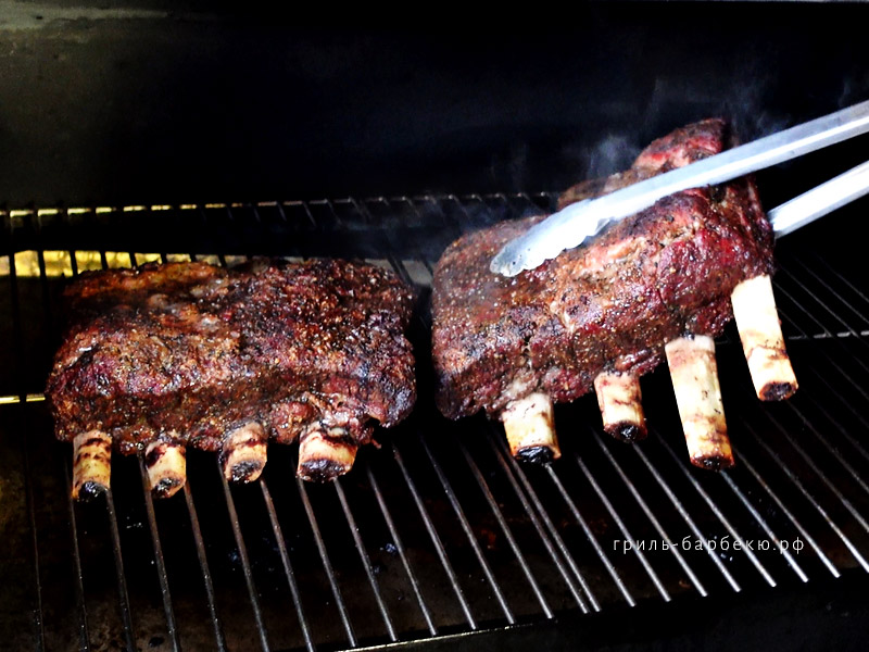 Обработайте 2 пластины говяжьих рёбер, как показано в нашем видео: снимите с мясной стороны как можно больше жира и отрежьте серебристую плёнку, а костную сторону можете оставить без обработки. В данном рецепте используются пластины из мраморной говядины, каждая весом около 2,2 кг.